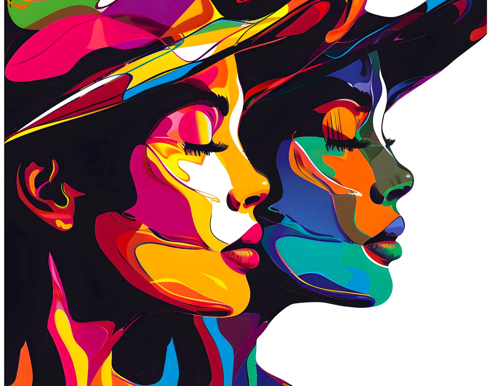 This vibrant pop art print showcases two women’s faces in profile, their wide eyes closed in serene expressions. The artwork features a stunning fusion of bold, mixed colours, creating a dynamic visual impact. Both women are wearing colourful summer bucket hats, adding a playful, retro touch to the piece. The striking contrast of the vibrant hues and the soft, calm expressions evokes a sense of stylish individuality. Perfect for those who love a splash of colour and modern flair, this print makes a standout addition to any space or a unique gift for art lovers.