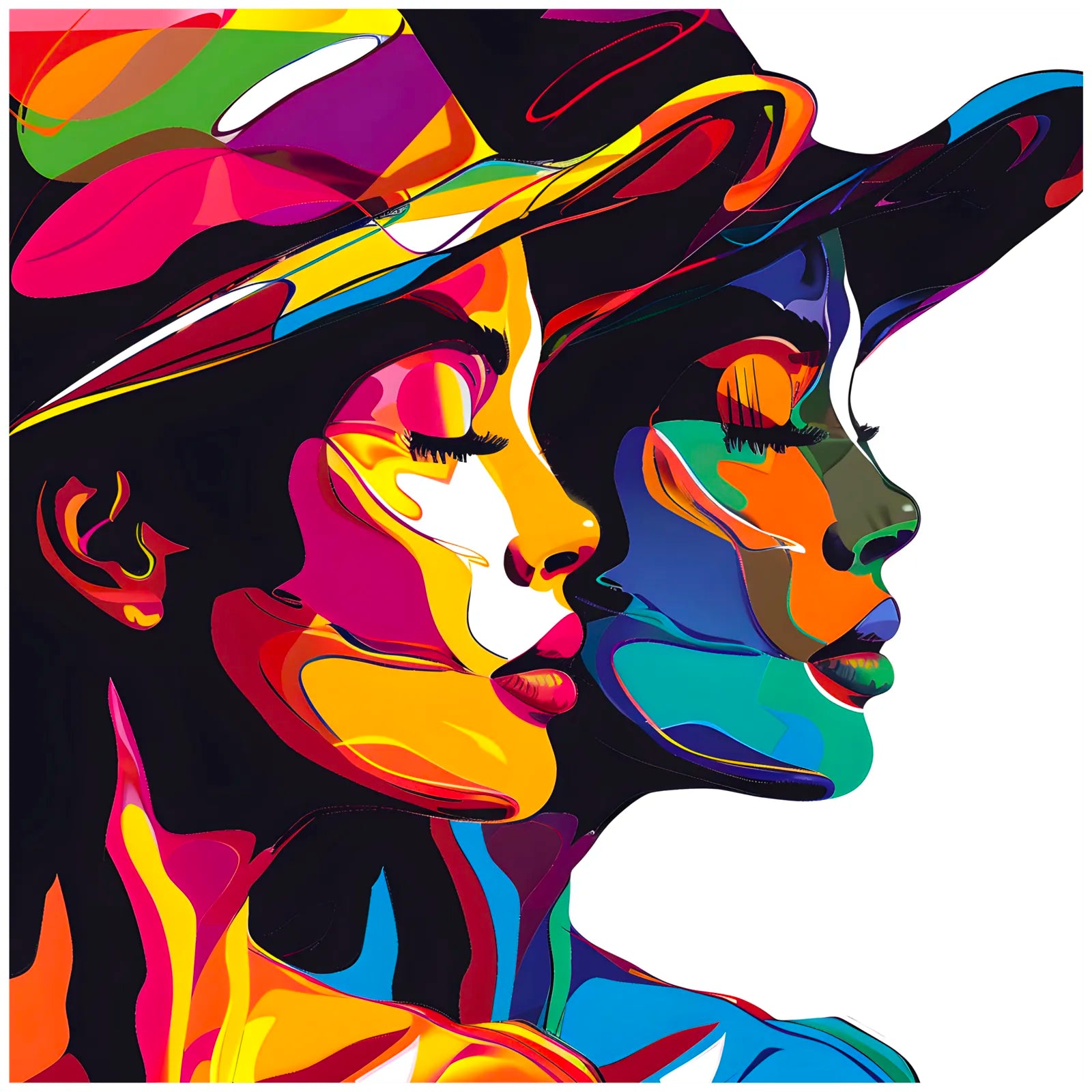 This vibrant pop art print showcases two women’s faces in profile, their wide eyes closed in serene expressions. The artwork features a stunning fusion of bold, mixed colours, creating a dynamic visual impact. Both women are wearing colourful summer bucket hats, adding a playful, retro touch to the piece. The striking contrast of the vibrant hues and the soft, calm expressions evokes a sense of stylish individuality. Perfect for those who love a splash of colour and modern flair, this print makes a standout addition to any space or a unique gift for art lovers.