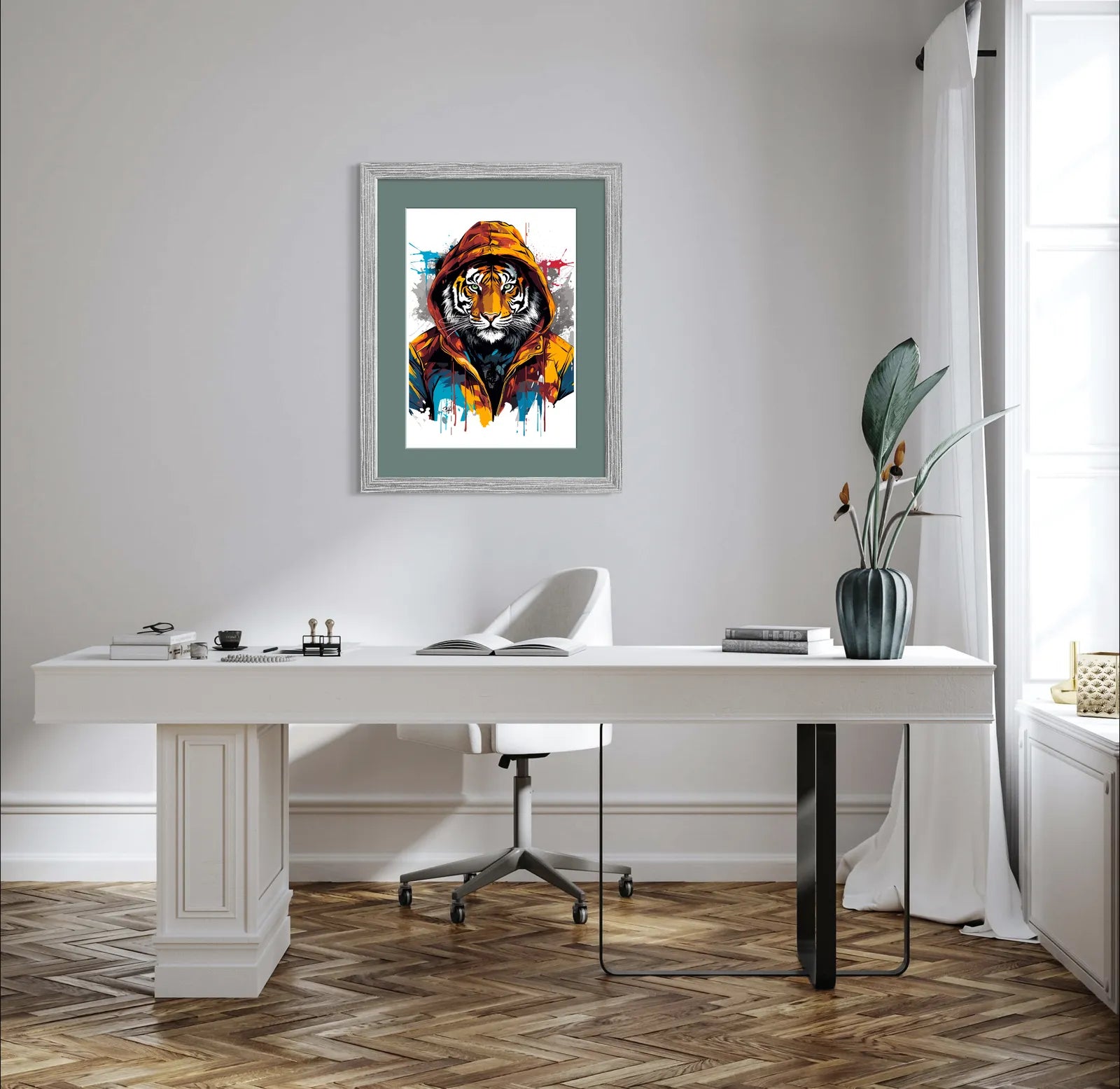 From our wild animals collection, this bold art print captures a stern-looking striped tiger, donned in a gold rain jacket with the hood up. The jacket is adorned in a graffiti-style spray of colours, with accents of grey, blue, and red that blend into splashes and drips around him, creating an intense, street-art-inspired look. His pastel green eyes add a piercing depth to his gaze, contrasting against the vibrant jacket and expressive background. Paint drips cascade from the bottom of the jacket, giving the piece a raw, urban edge perfect for adding dynamic flair to any modern space.